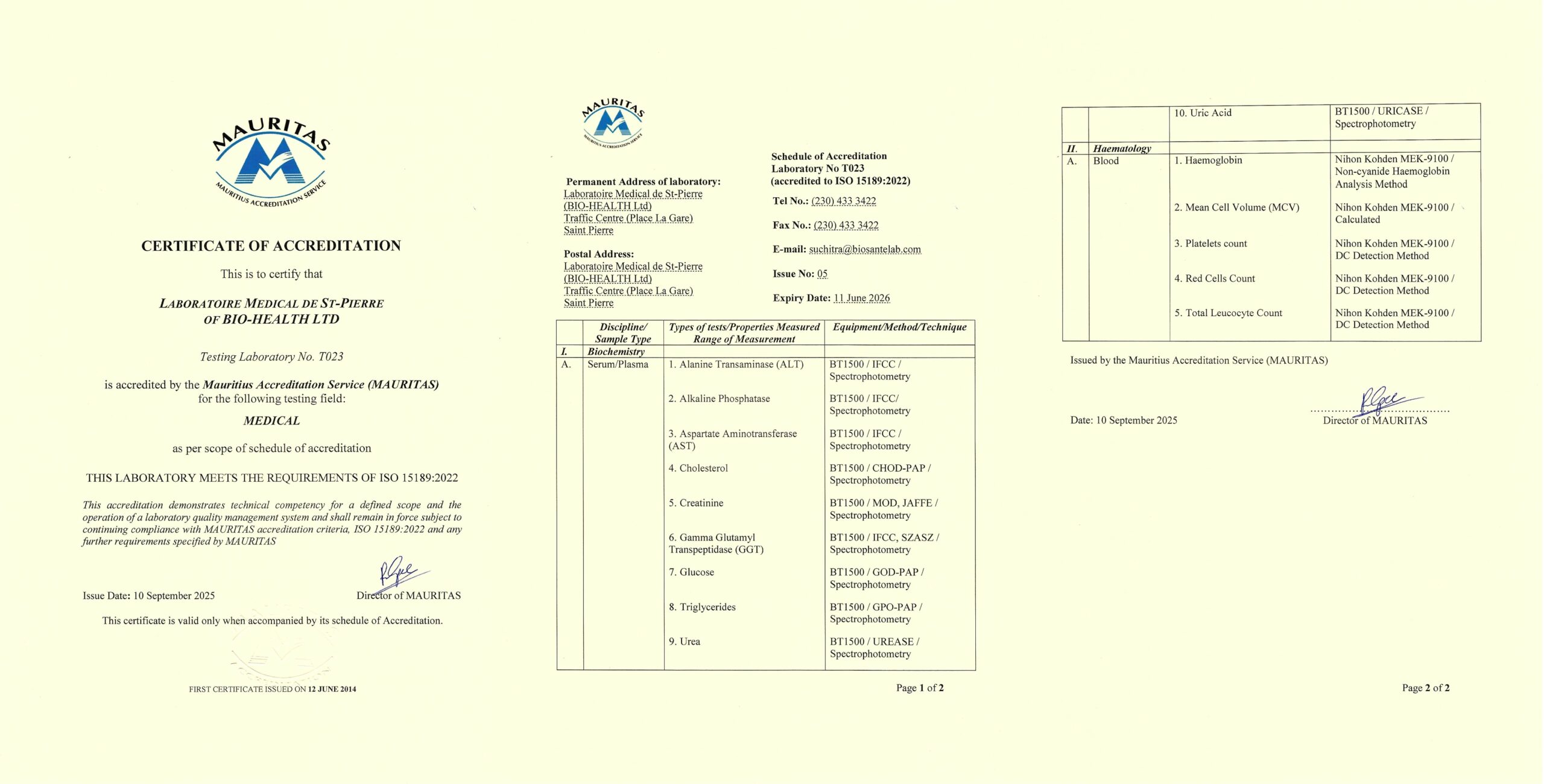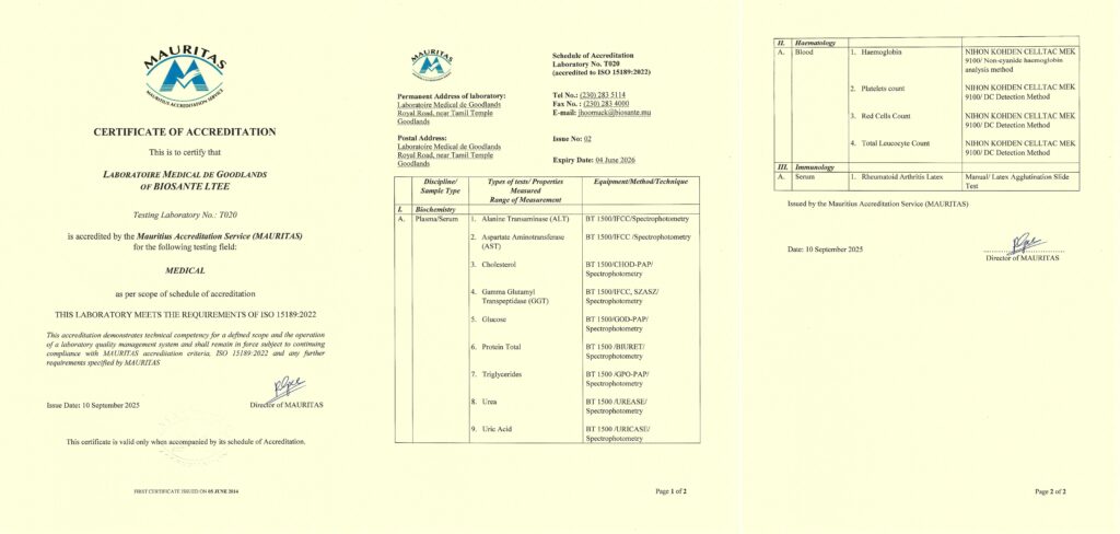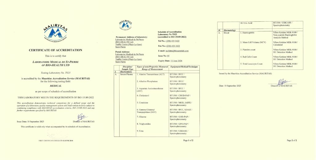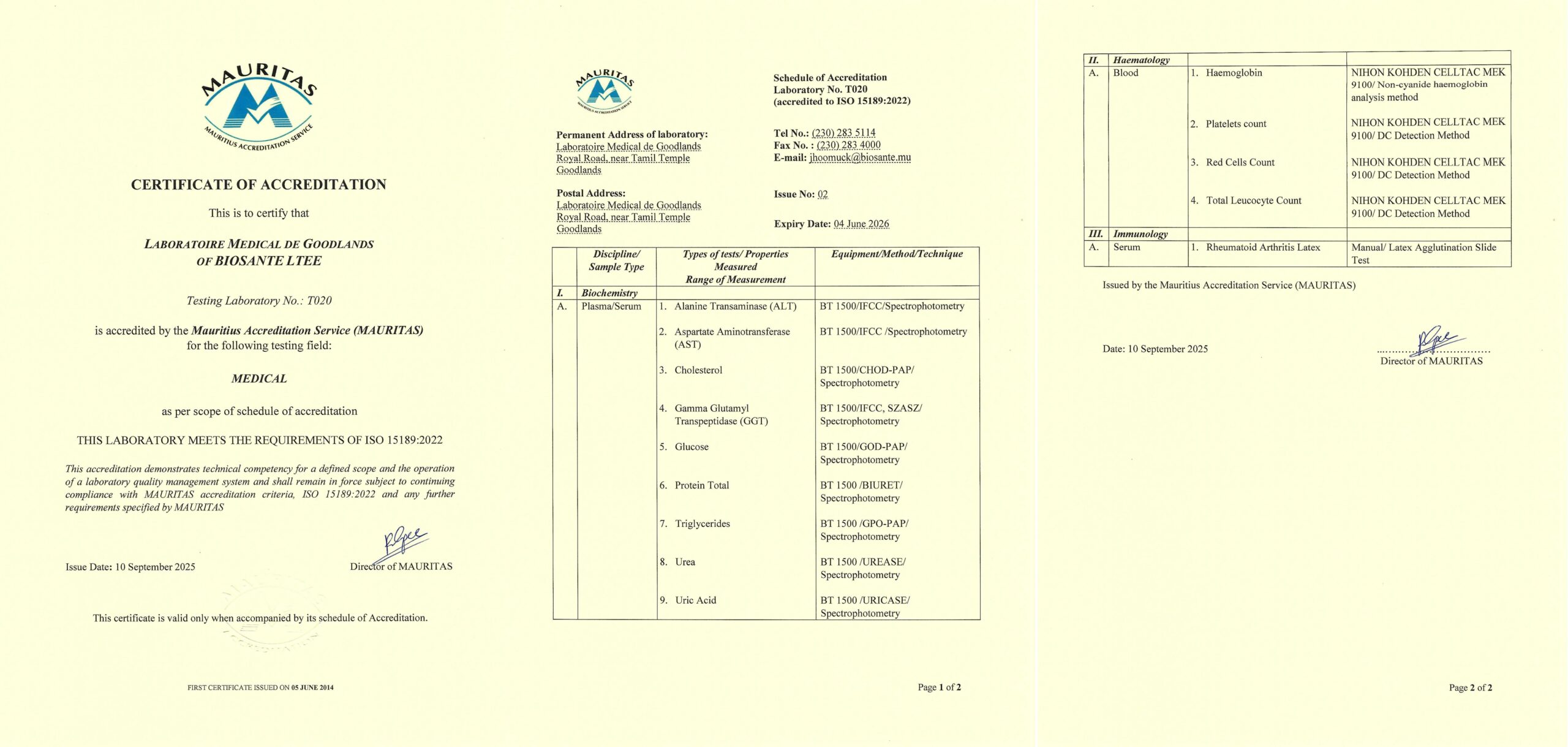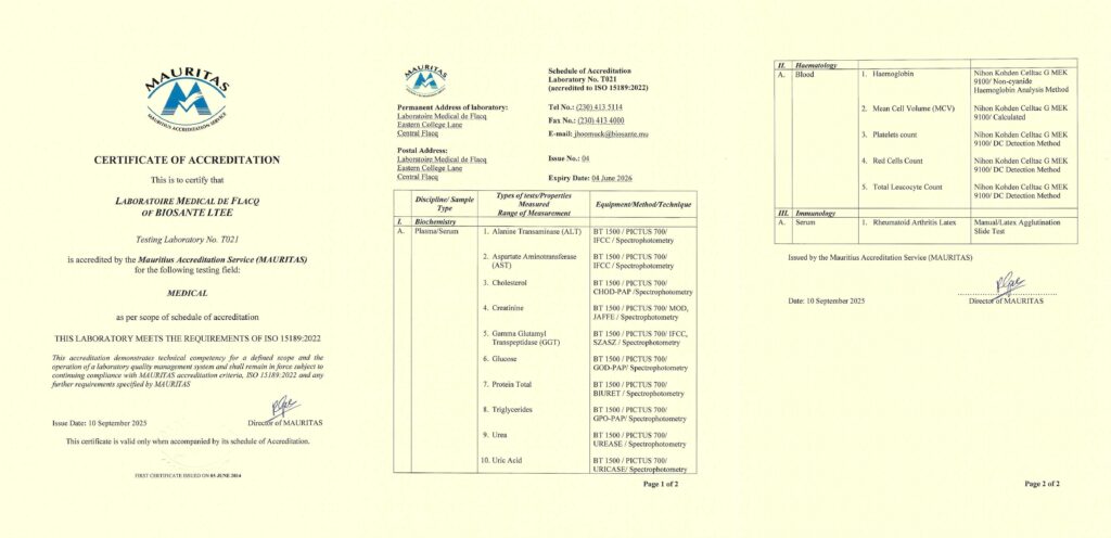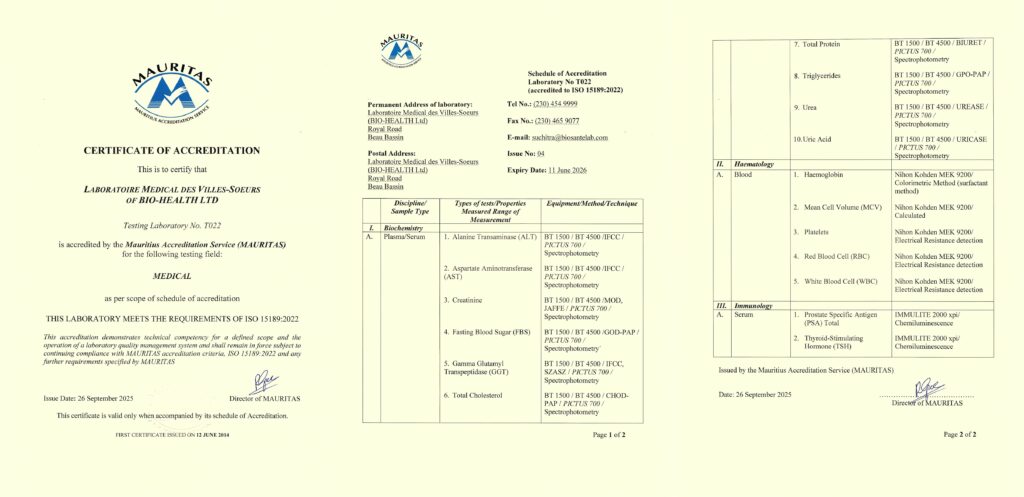 BIOSANTE Medical Laboratories are the FIRST Company in Mauritius to be accredited ISO 15189, in the Medical Testing Field by MAURITAS – the sole national authority in Mauritius providing unified service for the accreditation of calibration and testing laboratories, inspection bodies and certification bodies.